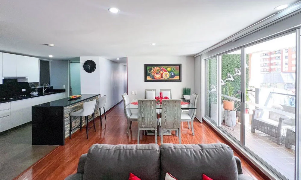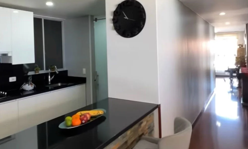 Hermoso Apartamento en venta ubicado en calle 161 # 54 Alejandría Bogota, Cocina Integral abierta, Zona de Lavandería Independiente, Sala de Entrada, Sala con Chimenea y Comedor, cuenta con una terraza de 9,83 mts con BBQ. El Edificio cuenta con Salón Social, Gimnasio, Piscina, Zona Húmedas, Salón de Juegos de Mesa, Parque infantil, Mini Golf, Pista de Trote. 144 mts 2 mas terraza 9,83 mts. 3 dormitorios con baño. 1 dormitorio y baño de servicio, 2 parqueaderos, 2 depósitos. vista exterior e interior.